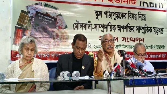 রোববার (২৮ জানুয়ারি) ‘স্কুলের পাঠ্যপুস্তকের বিষয় নিয়ে মৌলবাদী-সাম্প্রদায়িক অপশক্তির সাম্প্রতিক ষড়যন্ত্র’ শীর্ষক সংবাদ সম্মেলনে এক প্রশ্নের জবাবে তিনি এ কথা বলেন।