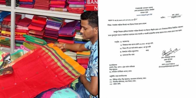 অনলাইন ডেস্কঃ টাঙ্গাইল শাড়ির ভৌগোলিক নির্দেশক (জিআই) পণ্য হিসেবে স্বীকৃতি পেতে জেলা প্রশাসনের পক্ষ থেকে আবেদন করা হয়েছে।