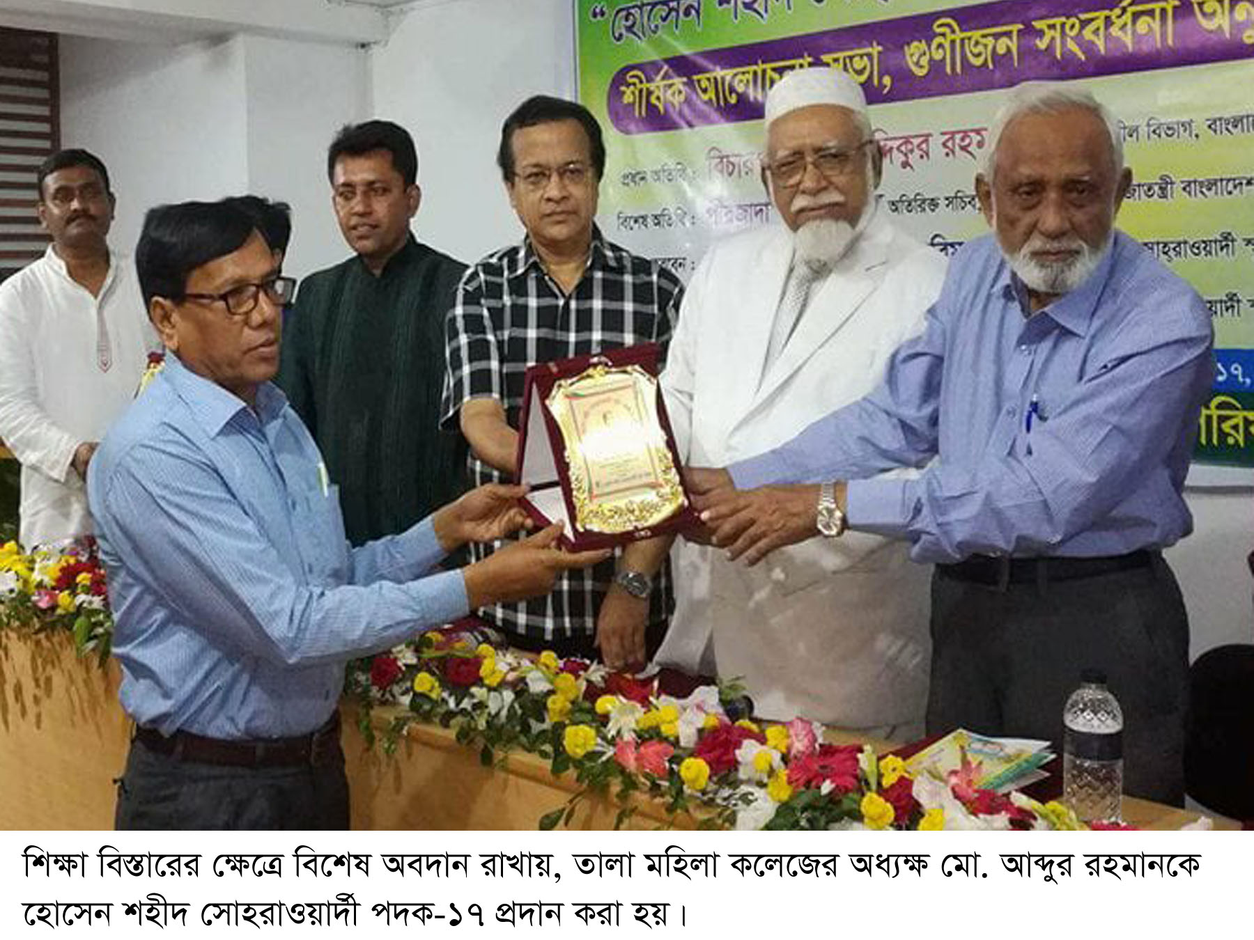 এএইচ জুয়েল, তালা (সাতক্ষীরা) প্রতিনিধিঃ তালা মহিলা ডিগ্রী কলেজের অধ্যক্ষ মো. আব্দুর রহমানকে শিক্ষা বিস্তারের ক্ষেত্রে বিশেষ অবদানের জন্য “হোসেন শহীদ সোহরাওয়ার্দী স্মৃতি পদক-২০১৭” দেয়া হয়েছে। হোসেন শহীদ সোহরাওয়ার্দী স্মৃতি পরিষদ (১০নভেম্ব) শুক্রবার ঢাকায় প্রফেসর আখতার ইমাম অডিটোরিয়ামে “হোসেন শহীদ সোহরাওয়ার্দীর কর্মময় জীবন শীর্ষক আলোচনা সভার মাধ্যমে উক্ত পদক দেয়া হয়। হোসেন শহীদ সোহরাওয়ার্দী স্মৃতি পরিষদ’র সভাপতি ভাষা সৈনিক মো. …